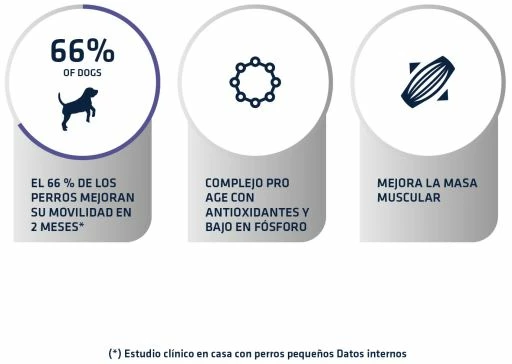 Gracias a su fórmula este tipo de alimento ayuda a preservar la salud y la movilidad articular en perros senior (+7 años) y a mejorar su masa muscular.