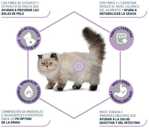 - Con fibra de guisante y extracto de malta que ayudan a prevenir las bolas de pelo.