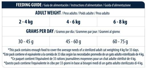 Aditivos nutricionales y organolépticos (por kg): vitamina A (33600 IU), vitamina D3 (1800 IU), vitamina E (400 mg), biotina (0,24 mg), taurina (1200 mg), L-carnitina (500 mg), fumarato ferroso (150 mg) (Fe: 45 mg), sulfato férrico monohidratado (261 mg) (Fe: 85 mg), yoduro de potasio (1,9 mg) (I: 1,4 mg), sulfato de cobre pentahidratado (33 mg) (Cu: 8,8 mg), sulfato manganoso monohidratado (123 mg) (Mn: 40 mg), sulfato de zinc monohidratado (396 mg) (Zn: 144 mg), selenito sódico (0,24 mg) (Se: 0,1 mg).