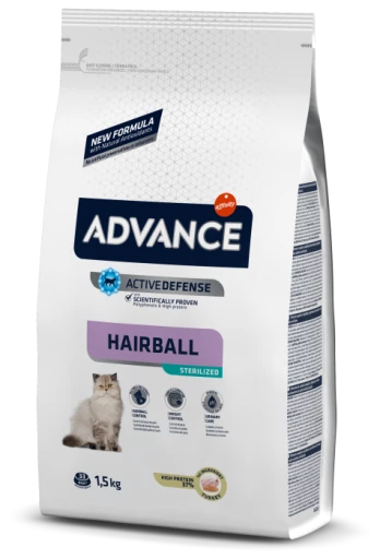 Advance Hairball sterilized ayuda a controlar el peso en gatos esterilizados, disminuye el riesgo de problemas urinarios, y gracias a la fibra de avena y al extracto de malta ayuda a evitar la formación de bolas de pelo.