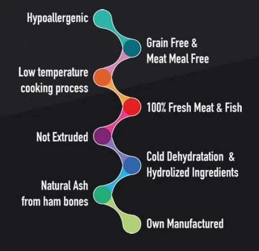 Carne y pescado fresco parcialmente hidrolizado. (35% carne de pavo fresca, 20% pescado entero fresco (alacha (Sardinella aurita), caballa (Scomber scombrus), jurel (Trachurus spp.), sardina (Sardina pilchardus)), 15% carne de cerdo fresca, 10% carne de pato fresca, 5% hígado de pollo fresco, almidón hidrolizado, huevos, pulpa de Beta Vulgaris, levadura de cerveza (Saccharomyces cerevisiae), boniato, zanahoria, manzana, comino (Cuminum cyminum), tomillo (Thymus vulgaris) cúrcuma (Curcuma longa)