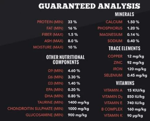 proteína bruta 31%, fibra bruta 2%, grasa bruta 16%, ceniza bruta 8%, humedad 16%, ácidos grasos poliinsaturados omega-3 EPA+DHA 2000 mg/kg, calcio 1,3%, fósforo 1,2%, hierro 70 mg/kg, glucosamina 4400 mg/kg, taurina 3000 mg/kg.