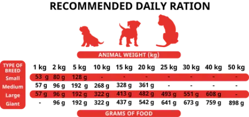 - Consulte la tabla de necesidades diarias de alimento como punto de referencia, variando la cantidad de alimento según la edad, nivel de actividad física, peso o raza.