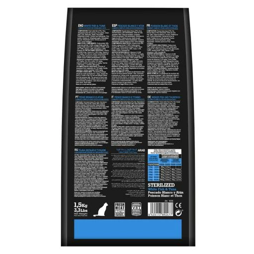 COMPOSICIÓN: Pescado blanco fresco (27%). Arroz. Pescado blanco y atún deshidratados. Gluten de maíz. Guisantes. Maíz. Pulpa de remolacha. Levaduras. Proteína de guisante. Pollo deshidratado. Hidrolizado de hígado de pollo. Proteína de arroz. Aceite de pollo. Manzana deshidratada. Brócoli deshidratado. Zanahoria deshidratada. Achicoria (fuente de FOS). Yucca schidigera. COMPONENTES ANALÍTICOS: Proteína bruta 35%. Aceites y grasas brutos 11,50%. Ácidos grasos omega-6 2%. Ácidos grasos omega-3 0,4%. Fibras brutas 3,95%. Ceniza bruta 7,80%. Calcio 1,15%. Fósforo 1,05%. Humedad 9%. ADITIVOS NUTRICIONALES: Vitamina A 18.000 UI/kg. Vitamina D3 1.450 UI/kg. Vitamina E 175 mg/kg. Hierro (sulfato ferroso monohidratado) 68 mg/kg. Yodo (yoduro potásico) 3,20 mg/kg. Cobre (sulfato cúprico pentahidratado) 9 mg/kg. Manganeso (sulfato manganoso monohidratado) 7,50 mg/kg. Zinc (óxido de zinc) 120 mg/kg. Selenio (selenito de sodio) 0,12 mg/kg. Taurina 1.100 mg/kg. L-carnitina 200 mg/kg. ADITIVOS TECNOLÓGICOS: Extractos de tocoferol de aceites vegetales 160 mg/kg. Reguladores de la acidez: Bisulfato sódico 5.000 mg/kg. MODO DE EMPLEO: El cambio de alimentación debe hacerse de forma gradual durante 7 días. Suministre el alimento en 2 tomas al día. No aproveche las dosis sobrantes del día anterior. La cantidad de alimento puede variar en función de la actividad, raza del gato y condiciones medioambientales. Los gatos deben disponer siempre de agua limpia y fresca. Conservar en lugar fresco y seco.
