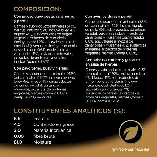 Composición: Con PAVO y BUEY estofados en deliciosa salsa: carnes y subproductos animales (45%, incluye 4% pavo, 4% buey), cereales, sustancias minerales, subproductos de origen vegetal. Con BUEY, PASTA y ZANAHORIAS en salsa: carnes y subproductos animales (45%, incluye 4% buey), verduras (incluye 4% zanahorias), productos de panadería (incluye 4% pasta), cereales, sustancias minerales, subproductos de origen vegetal, hierbas. Con POLLO y VERDURITAS en una deliciosa salsa: carnes y subproductos animales (45%, incluye 4% ave), verduras (incluye 4% mezcla de guisantes y zanahorias), cereales, sustancias minerales, subproductos de origen vegetal. Con CORDERO y GUISANTES en salsa de hierbas: carnes y subproductos animales (45%, incluye 4% cordero), verduras (incluye 4% guisantes), cereales, sustancias minerales, subproductos de origen vegetal, hierbas (0.1%)