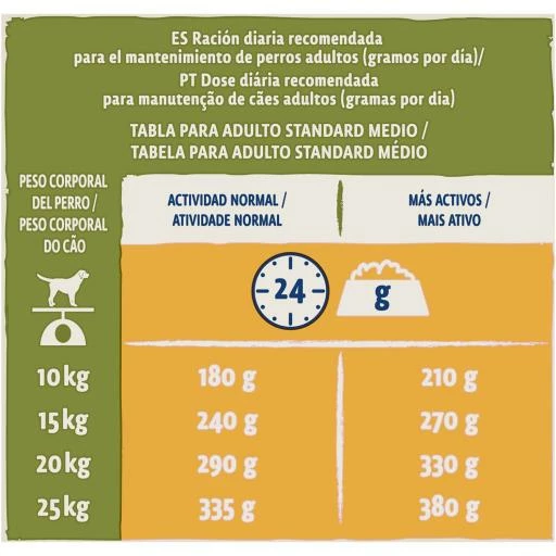 Las necesidades individuales varían y la cantidad de alimento debería ajustarse convenientemente para mantener a tu perro en un peso corporal magro y saludable.