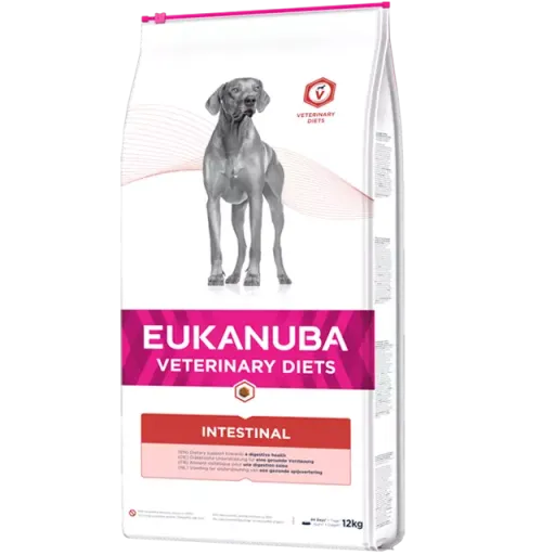 Eukanuba Veterinary Diets Intestinal Alimento seco para perros ayuda a regular nutricionalmente el aparato digestivo con ingredientes fácilmente digeribles, poca grasa y una mezcla especial de fibra.