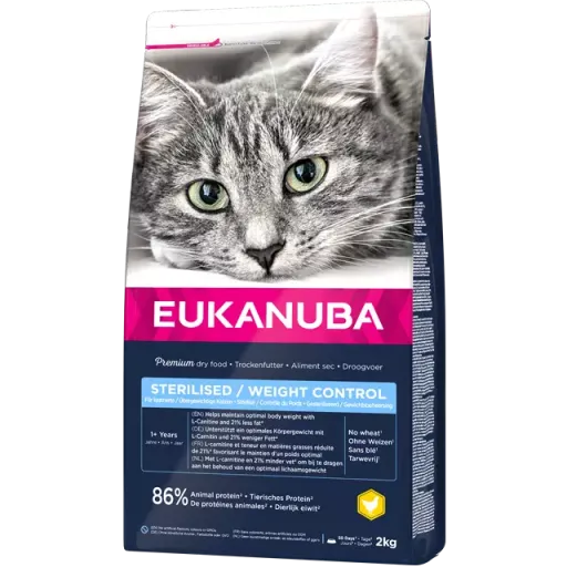 EUKANUBA Sterilised – Weight Control para gatos adultos esterilizados – es una fórmula 100 % completa y equilibrada. Formulada con L-carnitina y un 21 % menos de grasa, sin trigo ayuda a quemar grasas y a mantener un peso saludable.