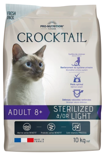 Crocktail Adult Sterilized 8+ con pescado es un alimento completo para gatos esterilizados mayores de 8 años. Indicado igualmente para gatos de esa edad con tendencia a engordar. El equilibrio de minerales en cantidad moderada permite evitar la sobrecarga renal y aporta un pH urinario óptimo.