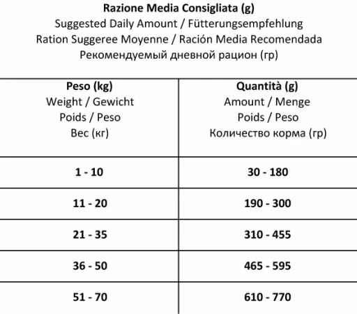 Componentes analíticos: proteínas 26%, aceites y grasas brutas 13%, fibra bruta 2,5%, humedad 9%, cenizas brutas 8%, ácidos grasos omega 6 3,5%, ácidos grasos omega 3 1,2%.