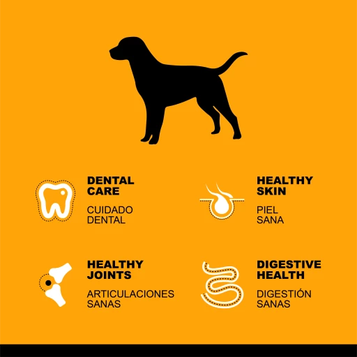 Una dieta completa, equilibrada y nutritiva que, gracias a los prebióticos y vitaminas que contiene, mejoran la salud digestiva, dental, de la piel y del aparato locomotor del perro