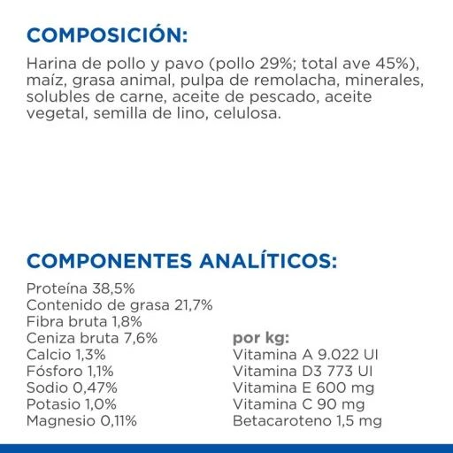 Harina de pollo y pavo (pollo 29%; total ave 45%), maíz, grasa animal, pulpa de remolacha, sustancias minerales, solubles de carne, aceite de pescado, aceite vegetal, semilla de lino, celulosa.