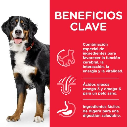 Hill’s 5+ Youthful Vitality Large Breed puede mejorar la actividad y la movilidad de tu perro senior de raza grande y ayudar a que disfrute de una digestión equilibrada, un sistema inmunitario fuerte y un pelaje brillante.