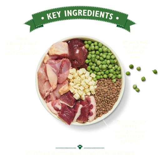 Composición: 42 % pollo y pato: pollo fresco (31 %), pato recién preparado (8 %), hígado de pollo (3 %). Boniato (29 %), guisantes enteros (6,5 %), lentejas enteras, proteína de guisantes, linaza, huevos, proteína de patata, salsa de pollo, minerales, extractos botánicos y hierbas aromáticas* (1 %), aceite de salmón, prebióticos (manano-oligosacáridos 1,3 g/kg, fructo-oligosacáridos 0,8 g/kg), zanahorias, manzanas, mezcla para el cuidado de las articulaciones (glucosamina 175 mg/kg, metilsulfonilmetano 175 mg/kg, sulfato de condroitina 125 mg/kg), arándanos rojos, espinacas.