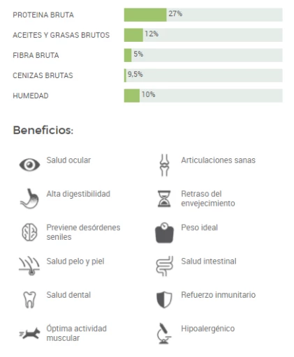 Pavo deshidratado (37%), arroz integral (22%), manzana deshidratada (7%), arroz entero, aceite de pato (4.3%), huevo entero deshidratado, aceite de salmón, fibras vegetales AD*, zanahoria deshidratada (1% ), acelga deshidratada (0.8%), remolacha roja deshidratada (0.7%) alga spirulina, extracto de yuca, piña deshidratada (0.2%), hojas de frambuesa roja (0.2%), Garcinia Cambogia, PROHEALTH (1%):, zanahoria deshidratada, tomate deshidratado, rosa de la India deshidratada, alfalfa deshidratada, algas deshidratadas, extracto de semilla de diente de león, brócoli deshidratado, extracto de semilla de té verde, manzanilla deshidratada, extracto de cítricos, aceite de borraja, extracto de semilla de orégano, extracto de semilla de cardo mariano, arándanos, L-carnitina, taurina, FOS, MOS, probióticos, PROJOINT COMPLEX (0.2%) : extracto de mejillón de labios verdes, extracto de krill y caldo de hueso ( fuentes naturales de colágeno, Condroitina y Glucosamina), PROSAFE COMPLEX (0.03%): romero, clavo, pomelo , cúrcuma y aceite de oliva.