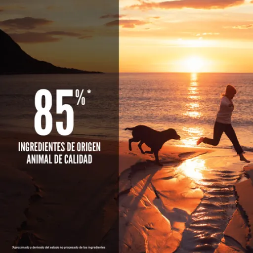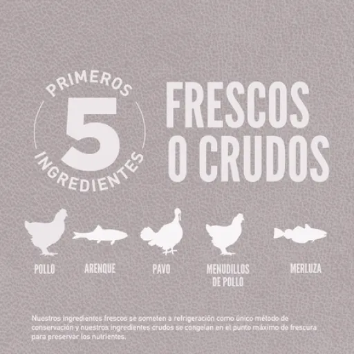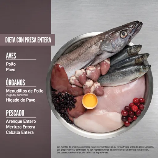 Esta preparación incluye grandes porcentajes de carnes y pescados frescos, específicamente el 85% de la composición es proteína apta para consumo humano, entre carne, pescado y huevos, incluyendo órganos y cartílagos para no necesitar ningún tipo de suplemento alimenticio.