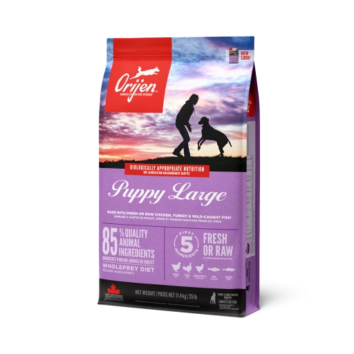 Orijen Dry Puppy Large es un pienso para cachorros de razas grandes, diseñado para cubrir las necesidades nutricionales de estas razas y aportar a tu mascota una dieta equilibrada que le suministre los nutrientes necesarios y el aporte calórico requerido para su nivel de actividad.
