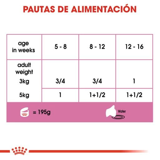 | 16 + semanas | 1 1/4 – 1 1/2 lata o Royal Canin Kitten | 1/2 lata + 30 – 50 g o Royal Canin Kitten |