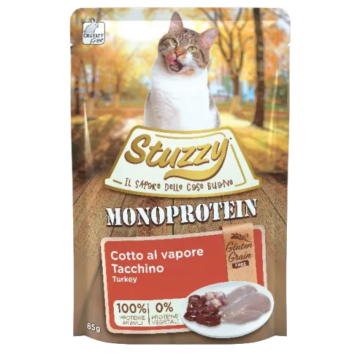 Deliciosos dados de pavo en una completa receta monoproteica para tu gato. Delicioso y nutritivo. Así es el Pavo Monoproteico Stuzzy, rico en ingredientes naturales cocinados al vapor… ¡pruébalo ya!