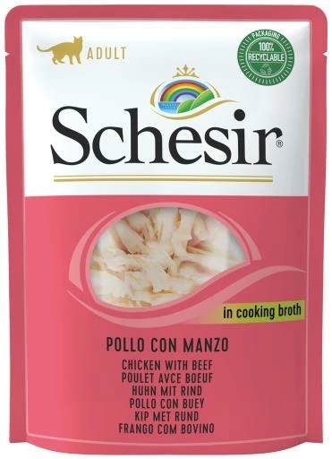 Una receta Schesir a base de auténticos filetes de pollo, combinados con delicioso buey para ofrecer a tu gato todo el placer de las mejores carnes seleccionadas. La receta se prepara en su propio caldo de cocción, para los gatos que aman un sabor natural y una textura más líquida.