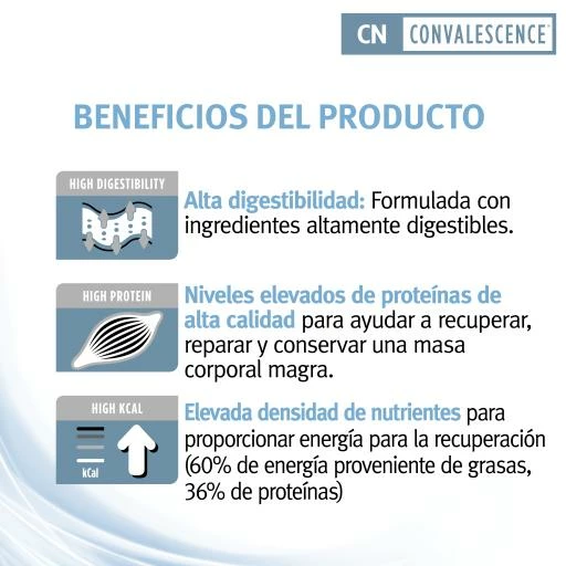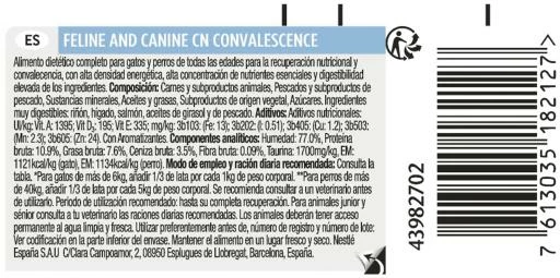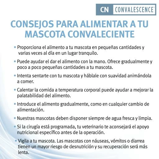 - Este alimento puede diluirse en agua (1:1) si se desea alimentar a través de sonda. La fórmula Feline and Canine CN Convalescence puede usarse en gatos con sondas. La ración debe adecuarse a la necesaria en función de las necesidades clínicas.