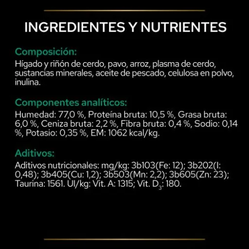 Hígado y riñón de cerdo, Pavo, Arroz, Plasma de cerdo, Sustancias minerales, Aceite de pescado, Celulosa en polvo, Inulina.