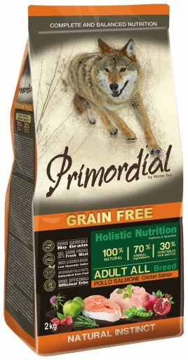 El pienso de Primordial para perros con Pollo y Salmón es un alimento de muy alta calidad con un 35% de salmón fresco. La destacable cantidad de proteína animal lo convierten en un alimento ideal, al proporcionarle al perro una proteína con los aminoácidos que necesita y que no están presentes en otros pienso con predominancia de proteína vegetal.