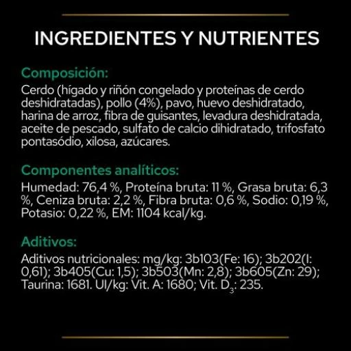 Humedad 76,4%, Proteína bruta 11,5%, Materias grasas brutas 6,3%, – Ácidos grasos omega-6 0,95%, – Ácidos grasos omega-3 0,3%, Hidratos de carbono 3,0%, Fibras brutas 0,3%, Fibras solubles 0,6%, Vitamina E 221 mg/kg, Energía metabolizable (EM)* 1,1 kcal/g