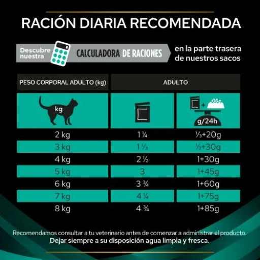 | Peso del gato (kg) | Ración diaria (sobre/día) |