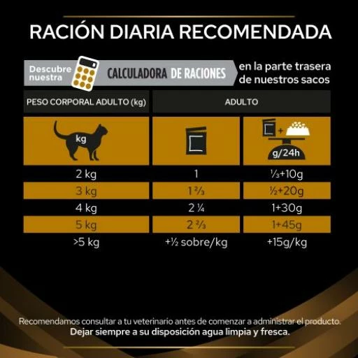 | Peso del gato (kg) | Ración diaria (sobre/día) |