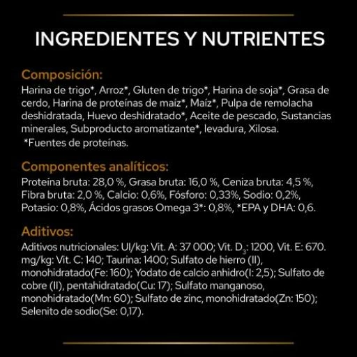 Humedad: 6,5%; Proteína bruta: 26%; Materias grasas brutas: 12%; Ácidos grasos omega-6: 1,28%; Ácidos grasos omega-3: 0,37%; Hidratos de carbono: 48%; Fibras brutas: 3%; Calcio: 0,6%; Fósforo: 0,5%; Potasio: 0,8%; Sodio: 0,2%; Taurina: 1.500 mg/kg; Vitamina E: 550 mg/kg; Energía metabolizable (EM)*: 3,6 kcal/g