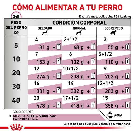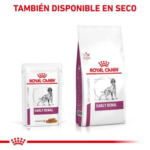 Como parte de la gama ROYAL CANIN® Veterinary Health Nutrition, solo debes dar este producto a tu mascota si te lo recomienda un veterinario. La transición de tu mascota de una dieta a otra debe realizarse de forma lenta y gradual durante un período de 7 a 10 días. Debes asegurarte de ofrecer las raciones correctas, particularmente si la alimentación es mixta. Para satisfacer las preferencias individuales de cada perro, ROYAL CANIN® Early Renal también está disponible en forma de alimento seco con croquetas crujientes.