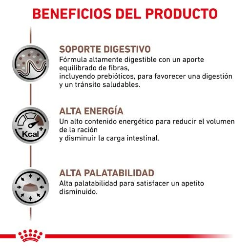 Gracias a su fórmula de alta palatabilidad, esta dieta esta específicamente diseñada para fomentar la aceptación del alimento por parte de gatos con pérdida de apetito. Esta dieta también contribuye a un entorno urinario desfavorable para el desarrollo de cálculos de estruvita y oxalato de calcio. Como parte de la gama ROYAL CANIN® Veterinary Health Nutrition, solo debes dar este producto a tu mascota si te lo recomienda un veterinario.