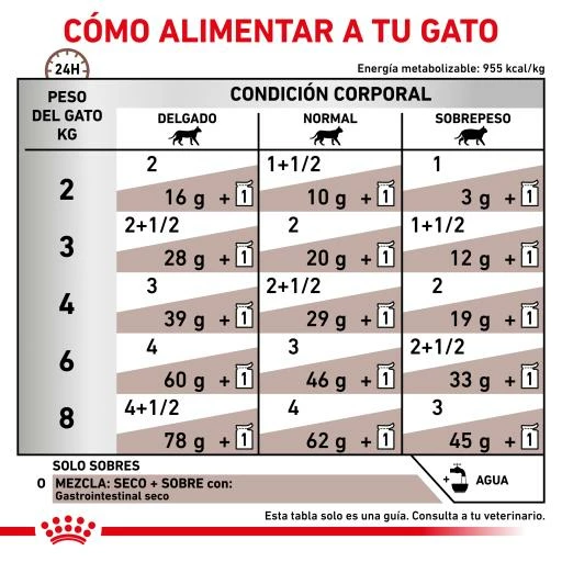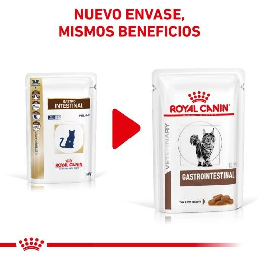 La transición de tu mascota de una dieta a otra debe realizarse de forma lenta y gradual durante un período de 7 a 10 días. Debes asegurarte de ofrecer las raciones correctas, particularmente si la alimentación es mixta. Para satisfacer las preferencias individuales de cada gato, ROYAL CANIN® Gastrointestinal también está disponible en forma de alimento seco con croquetas crujientes.