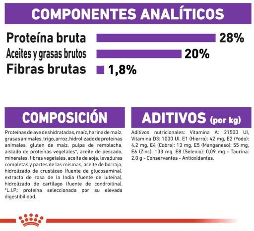 Carne de ave deshidratada, harina de maíz, maíz, grasas animales, gluten de maíz, hidrolizado de proteínas animales, pulpa de remolacha. Aceite de pescado, minerales, aceite de soja, levaduras, huevo deshidratado, hidrolizado de crustáceo (fuente de glucosamina), hidrolizado de cartílago (fuente de condroitina).