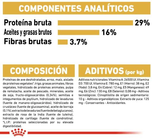 Proteínas de ave deshidratadas, arroz, maíz, aislado de proteínas vegetales*, trigo, grasas animales, fibras vegetales, hidrolizado de proteínas animales, pulpa de remolacha, aceite de pescado, minerales, aceite de soja, fructo-oligosacáridos (0,34%), semillas e integumentos de psyllium, hidrolizado de levaduras (fuente de manano-oligosacáridos), hidrolizado de crustáceo (fuente de glucosamina), aceite de borraja (0,1%), extracto de levaduras (fuente de betaglucanos), extracto de rosa de la India (fuente de luteína), hidrolizado de cartílago (fuente de condroitina).
