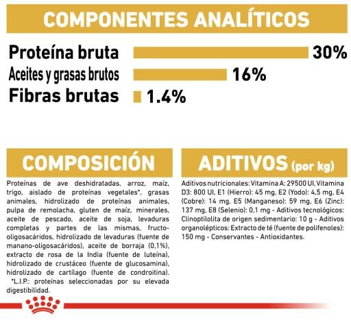Proteínas de ave deshidratadas, arroz, maíz, trigo, aislado de proteínas vegetales*, grasas animales, hidrolizado de proteínas animales, pulpa de remolacha, gluten de maíz, minerales, aceite de pescado, aceite de soja, levaduras completas y partes de las mismas, fructo-oligosacáridos, hidrolizado de levaduras (fuente de manano-oligosacáridos), aceite de borraja (0,1%), extracto de rosa de la India (fuente de luteína), hidrolizado de crustáceo (fuente de glucosamina), hidrolizado de cartílago (fuente de condroitina).