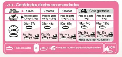 | Gata embarazada | 4 kg | 51 g – 74 g | 29g – 56 g + 1 sobre |