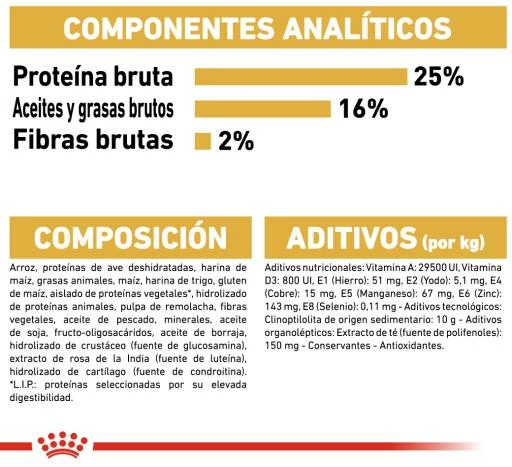 Arroz, proteínas de ave deshidratadas, harina de maíz, grasas animales, maíz, harina de trigo, gluten de maíz, aislado de proteínas vegetales*, hidrolizado de proteínas animales, pulpa de remolacha, fibras vegetales, aceite de pescado, minerales, aceite de soja, fructo-oligosacáridos, aceite de borraja, hidrolizado de crustáceo (fuente de glucosamina), extracto de rosa de la India (fuente de luteína), hidrolizado de cartílago (fuente de condroitina).