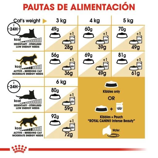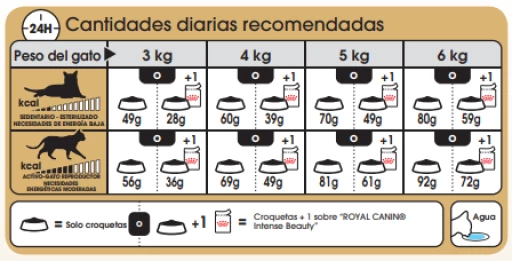 | Bajas necesidades de energía (croquetas + sobre) | 28 g + 1 sobre | 39 g + 1 sobre | 49 g + 1 sobre | 59 g + 1 sobre |