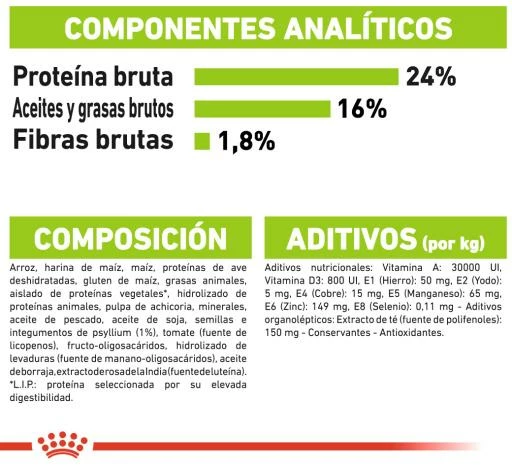 Arroz, harina de maíz, maíz, proteínas de ave deshidratadas, gluten de maíz, grasas animales, aislado de proteínas vegetales*, hidrolizado de proteínas animales, pulpa de achicoria, minerales, aceite de pescado, aceite de soja, semillas e integumentos de psyllium (1%), tomate (fuente de licopenos), fructo-oligosacáridos, hidrolizado de levaduras (fuente de manano-oligosacáridos), aceite de borraja, extracto de rosa de la India (fuente de luteína).