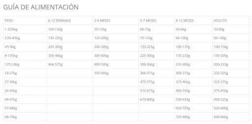 El cambio de alimento debe hacerse de forma gradual durante 7 días. Suministrar la ración diaria en 2 o 3 tomas repartidas durante el día. La cantidad de alimento puede variar en función de la actividad, raza del perro y condiciones ambientales. El perro debe disponer siempre de agua limpia y fresca. Conservar en lugar fresco y seco.