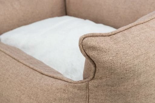 Esta cama tiene un diseño único, con bordes elevados que protegen del frío y del viento, y una tela tejida y felpa que le dan un aspecto elegante y suave. El cojín reversible tiene dos caras, una de tejido y otra de felpa, para adaptarse a las preferencias de cada perro.